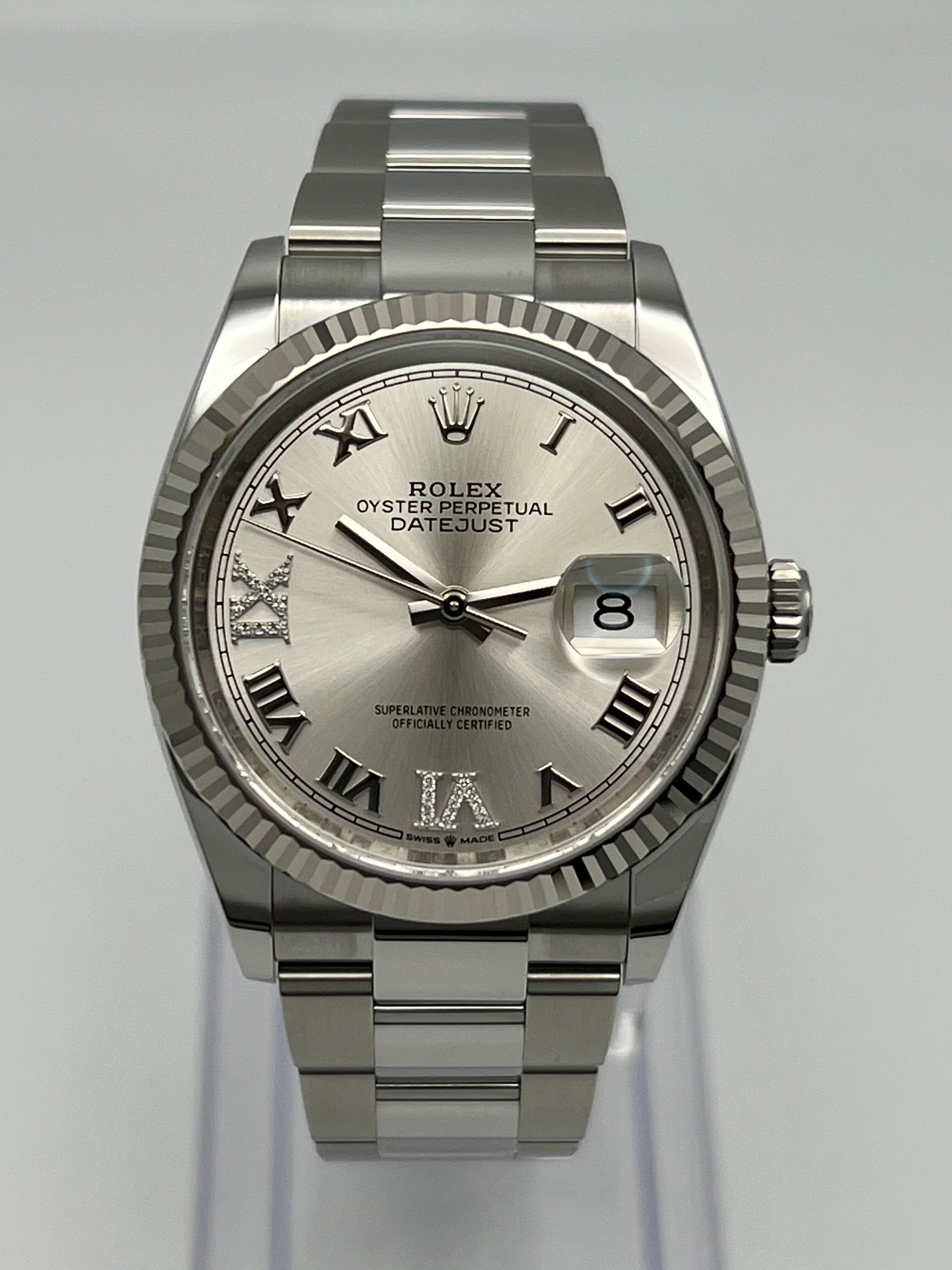 Its dial features a Roman VI and IX in 18 ct gold. set with 24 diamonds. The light reflections on the case sides and lugs highlight the elegant profile of the 36 mm Oyster case. which is fitted with a fluted bezel. Aesthetically. the Datejust has spanned eras. while retaining the enduring codes that make it. notably in its traditional versions. one of the most recognized and recognizable of 2025 Watches. It comes on a stainless steel oyster bracelet with a steel folding clasp.??